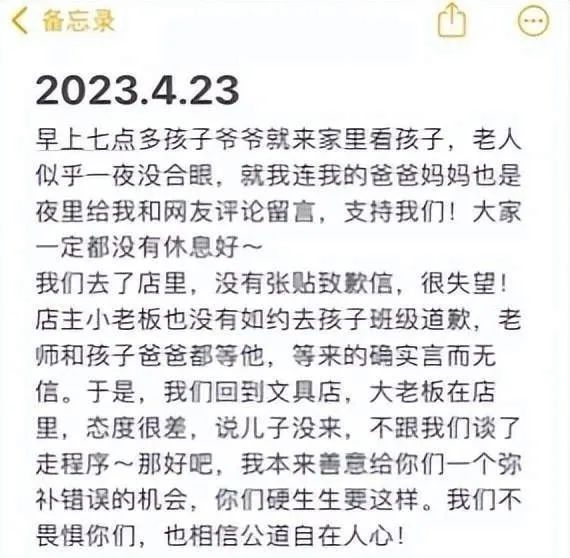 文中提到,虽然进行了口头道歉,但店家表示远远不够。“现本店及全体店员接受广大网友的批评,我们愿尽全力弥补带来的伤害,包括到学校、登门拜访(需征得家长同意)、张贴公告等方式,消除本次事件的影响。”