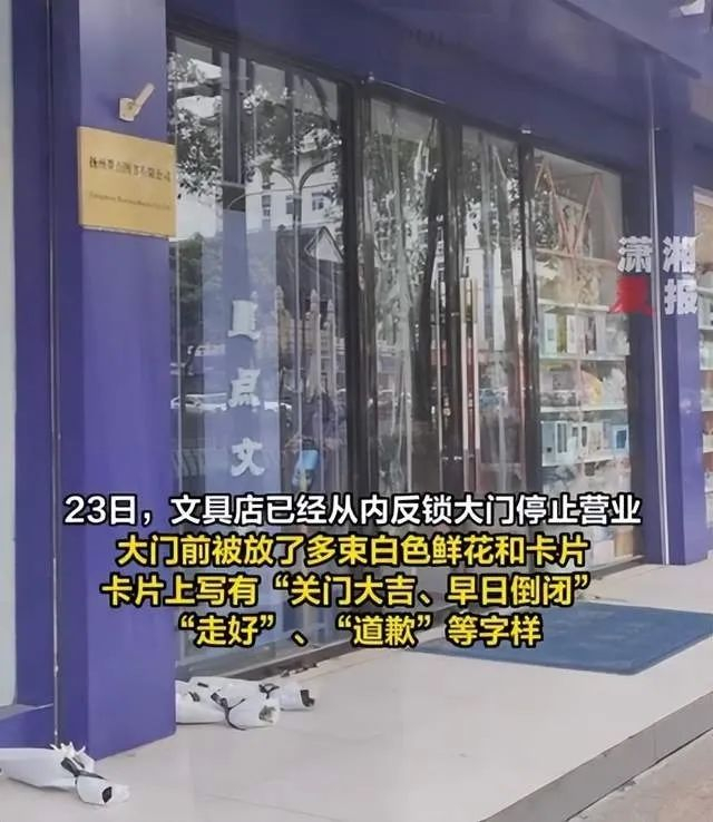 据潇湘晨报报道,目前该文具店已经反锁停止营业,店门口被放白花和卡片,卡片上写着“关门大吉”等字样。