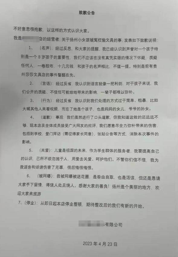 文创店老板冤枉8岁女孩偷东西引众怒,公开道歉了!