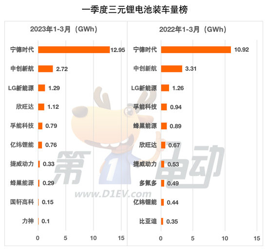 对比去年一季度,今年一季度宁德时代以29.25GWh的装车量稳居冠军宝座,比亚迪、中创新航、国轩高科依然稳居榜单前四。从第五位开始,名次发生改变,亿纬锂能超越LG新能源和蜂巢能源位居榜单第五,欣旺达排名上升3位至第六。