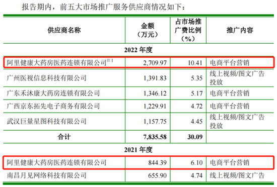 同时,2021年、2022年第一大客户阿里健康大药房,还是知原药业的第一大市场推广服务供应商。2020年,阿里健康大药房是公司第二大市场推广服务供应商,2021年、2022年均为第一大市场推广服务供应商,占市场推广费比例分别为6.10%、10.41%。