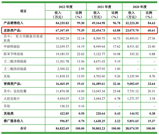皮肤类产品是知原药业主要营收来源,2020-2022年,皮肤类产品销售收入占比从60.61%增至79.39%,肾病类产品销售收入占比从23.64%下降至19.41%。