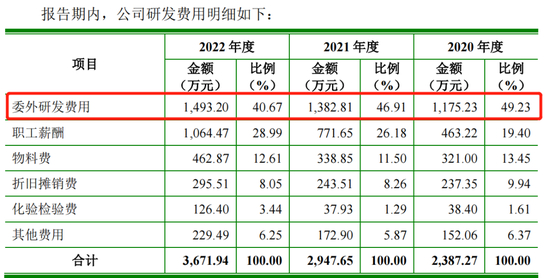 乐居财经《预审IPO》发现,研发费用中,委外研发费用分别为1175.23万元、1382.81万元、1493.20万元,占研发费用的比重为49.23%、46.91%、40.67%。