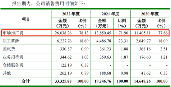 知原药业销售费用主要由市场推广费、职工薪酬、差旅费、业务招待费、仓储服务费及其他构成。2020-2022年,知原药业市场推广费分别为1.14亿元、1.39亿元、2.60亿元,占比分别为77.86%、71.96%、78.13%。三年市场推广费合计5.13亿元,而知原药业的三年净利润合计才为2.74亿元,市场推广费接近净利润的两倍。