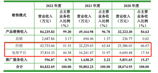 知原药业按销售模式可分为直销、经销、电商平台三种模式,2020-2022年,通过经销模式销售的收入占比分别为66.67%、63.44%、51.55%,逐年下降;通过电商平台模式销售的收入占比分别为17.34%、31.97%、44.58%,逐年上升。在2022年,经销模式与电商平台模式的销售收入差不多各占半壁江山。