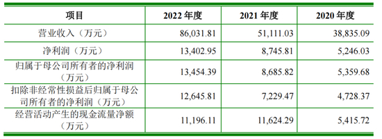 据招股书,2020-2022年,知原药业实现营收3.88亿元、5.11亿元和8.6亿元,2021年、2022年同比分别增长31.61%、68.32%;同期净利润分别为5359.68万元、8685.82万元和1.35亿元,2021年、2022年同比增长62.06%、54.90%。