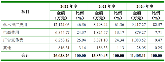 从构成来看,市场推广费包括学术推广费用、电商费用、广告宣传费及其他。报告期内,学术推广费用金额分别为9417.27万元、8498.44万元、1.21亿元,占比分别达82.57%、61.36%、46.56%。