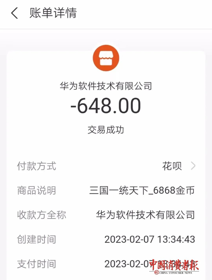 近日,北京市消费者何女士称,今年2月份,13岁的孩子向她借手机下载一款软件。几个小时后,她拿回手机,发现微信和支付宝有扣费,不到10分钟一共扣除了1300多元,收款方是华为软件技术有限公司,扣费的去向是给“三国·一统天下”游戏充值。