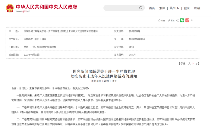国家新闻出版署下发的《关于进一步严格管理切实防止未成年人沉迷网络游戏的通知》。