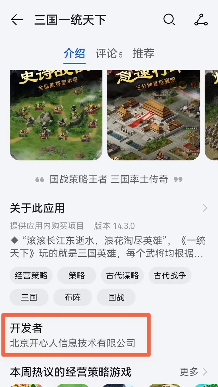 《中国消费者报》记者通过“企查查”查询发现,华为软件技术有限公司由华为技术有限公司全资持股,其业务主要包括从事软件及通信相关领域产品的研发、制造、销售、服务等。而华为“应用市场”显示,“三国·一统天下”游戏由北京开心人信息技术有限公司开发。