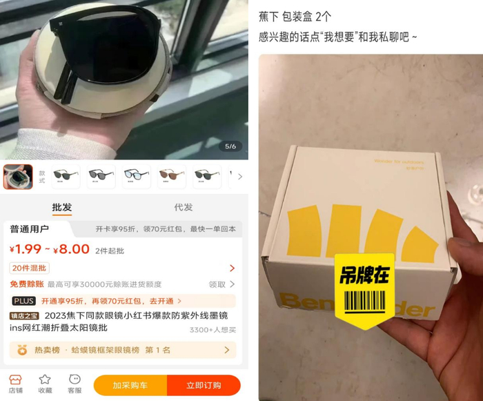 对此,潘哥突发奇想,如果从阿里巴巴上采购墨镜,装在闲鱼买来的空盒子里,再注册一家网店来销售,这款山寨版蕉下墨镜,是不是永远不会被发现?