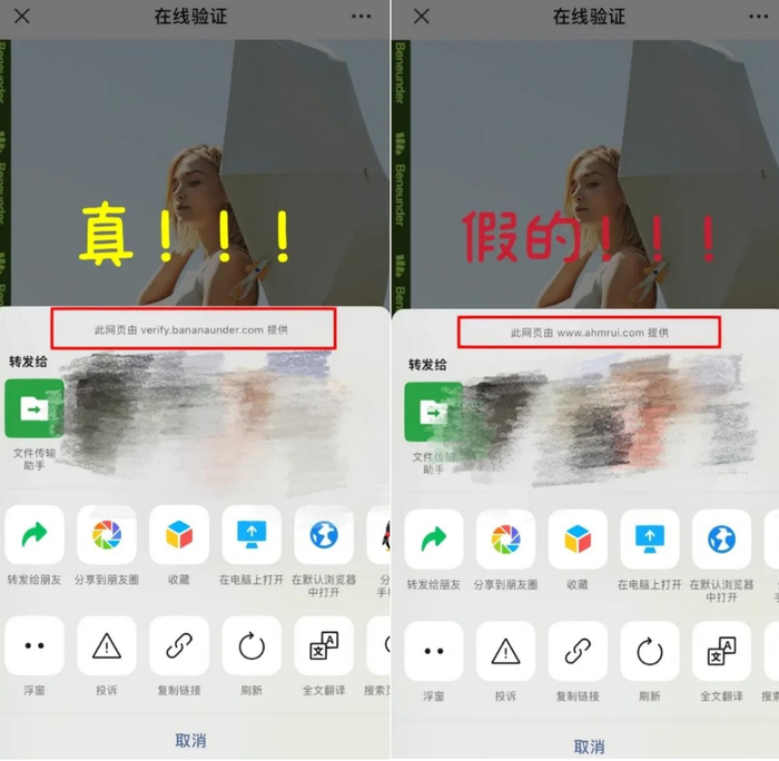 至此,阿囧才最终发现,原来卖假货的人,做出了与官方相同的验证页面,如果不进入官方公众号,而是直接扫防伪码的话,用户很容易上当受骗,误以为买到真货。