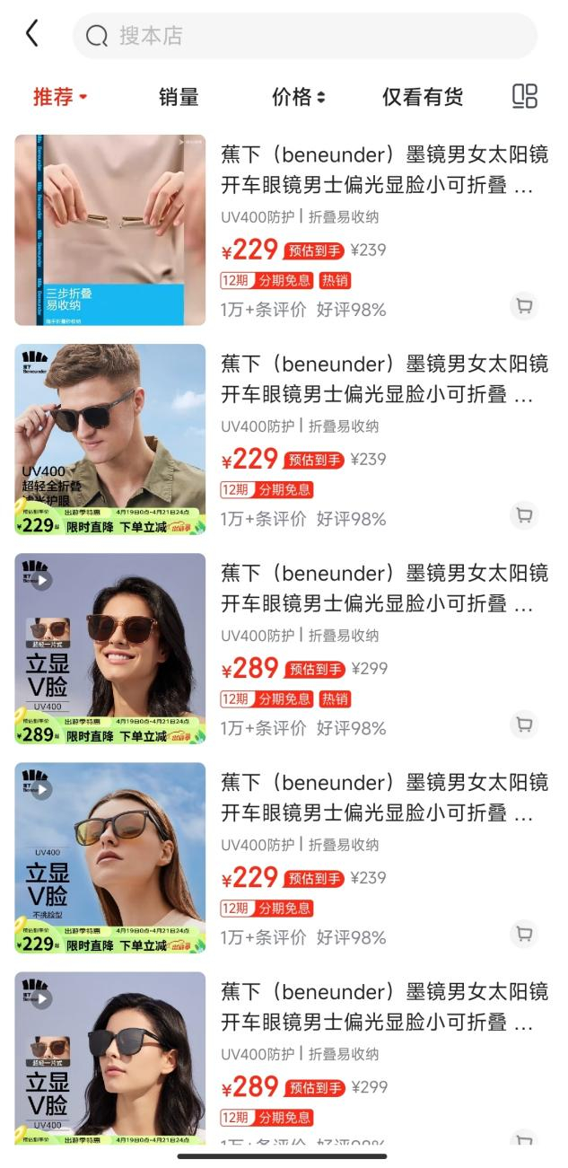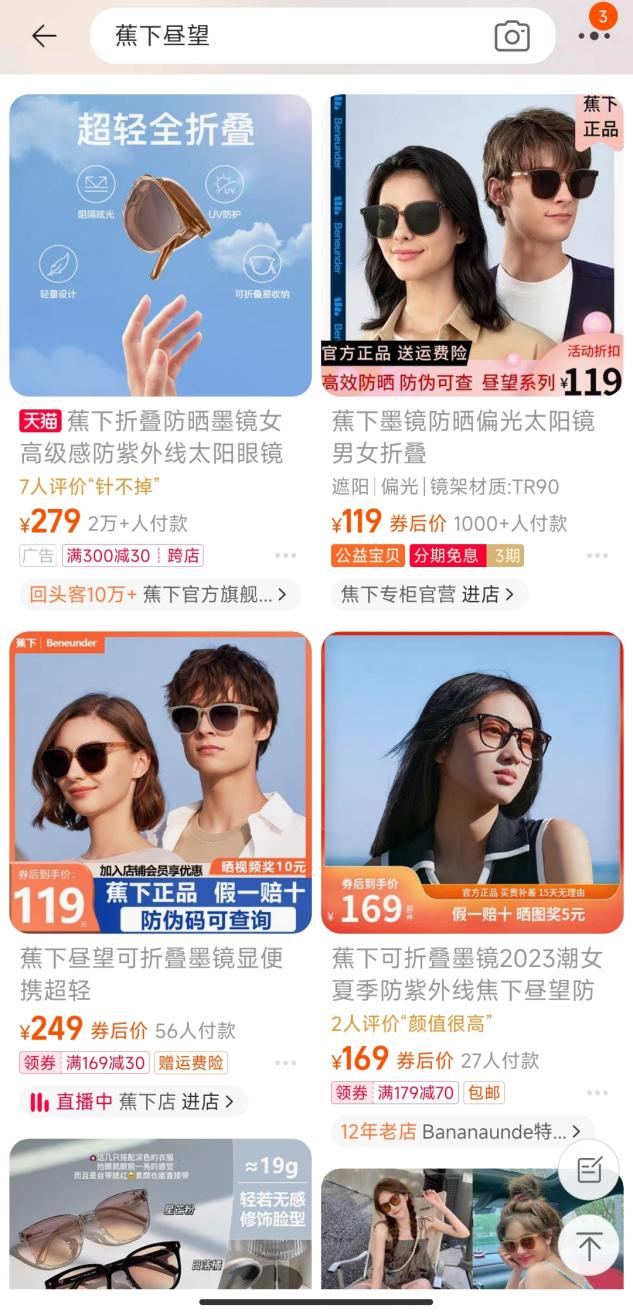潘哥发现,仅仅在淘宝上,同款蕉下昼望系列可折叠墨镜,就有多种不同价格。其中,蕉下官方旗舰店售价279元;蕉下店售价249元,焦下专柜店售价119元,bananaunder特卖店售价169元。