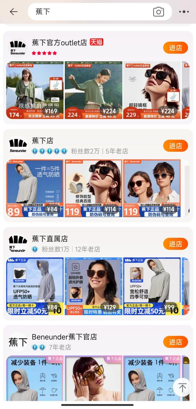 比如,潘哥在淘宝发现,冠名“蕉下”的店铺,就有蕉下官方旗舰店、蕉下官方outlet店、蕉下店、蕉下直属店、蕉下正品总店、Beneunder蕉下官店、Beneunder蕉下品牌店……