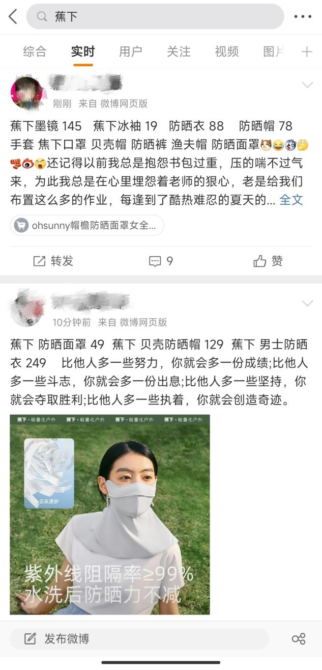比如,潘哥在微博上,发现有不少营销账号,发布有关蕉下的广告,广告中带有防屏蔽的迷惑文案。而点击下方购物车链接,就能跳转到淘宝、拼多多等平台上,包括官方旗舰店在内的蕉下店铺。