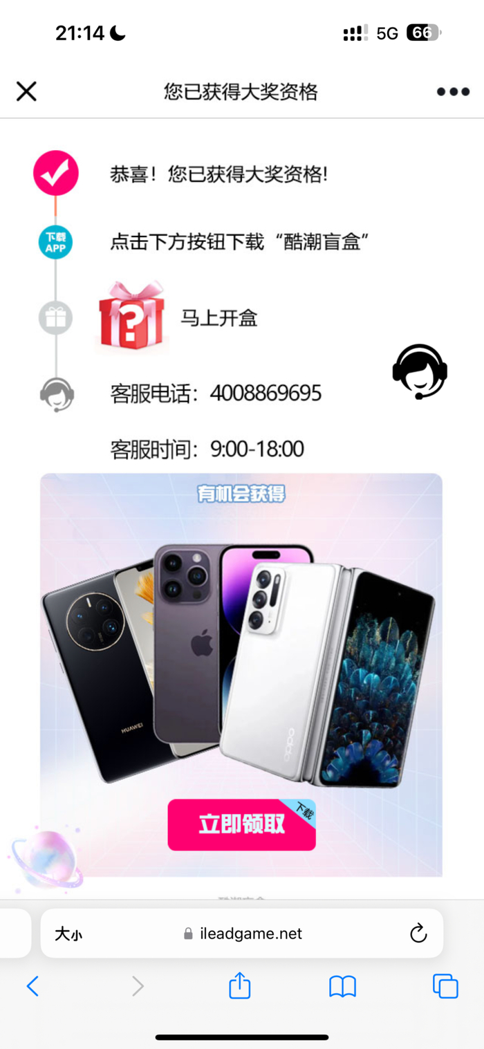 为了进一步了解酷潮盲盒是否存在诱导消费的行为,记者通过受访者提供的链接进入中奖页面,页面有“恭喜!您已获得大奖资格!”“下载‘酷潮盲盒’”“马上开盒”等字样,与此同时,还有多款大牌手机的宣传图片赫然在目,难免让人误以为自己抽中了手机。
