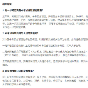 近日,杭州市教育局等六部门发布了进一步规范完善杭州市区中考加分项目的通知。
