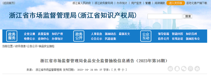 浙江省市场监督管理局发布2023年第16期食品安全监督抽检信息