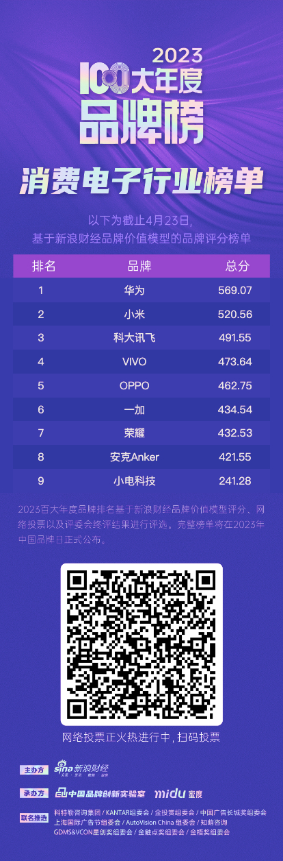 “百大年度品牌评选”进程过半,消费电子赛道华为569分,超过小米近50分