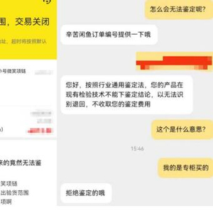 随即,张女士向验货宝客服咨询订单关闭的缘由,客服回应称,“产品在现有检验技术下不能下鉴定结论,以无法识别退回”,并给出了“拒绝鉴定”的答复。这让张女士十分不解,“项链是我在国内专柜购买的,所有凭证都有,为何‘超出验货范围’无法鉴定?验货宝存在的意义在哪?”
