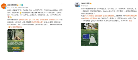 配合线下营销动作,尚品宅配与三大品牌在线上开展频繁互动。比如微博用户只要在转发时带上#自然无界随心野#话题词,并关注尚品宅配家居、携程旅行网、CAMEL骆驼、骆驼露营、极氪ZEEKR这些官方账号,就能参与抽奖。而四大品牌也在自己的官方渠道及私域渠道宣发关于此次跨界合作的内容,强化各自受众群体的对本次跨界的认知。这样频繁的互动,将四大品牌具备相同特质的粉丝汇聚在一起,最大限度增强了本次跨界活动在“同温层”的传播力度,为自然无界的营销带来更广范围的助力。