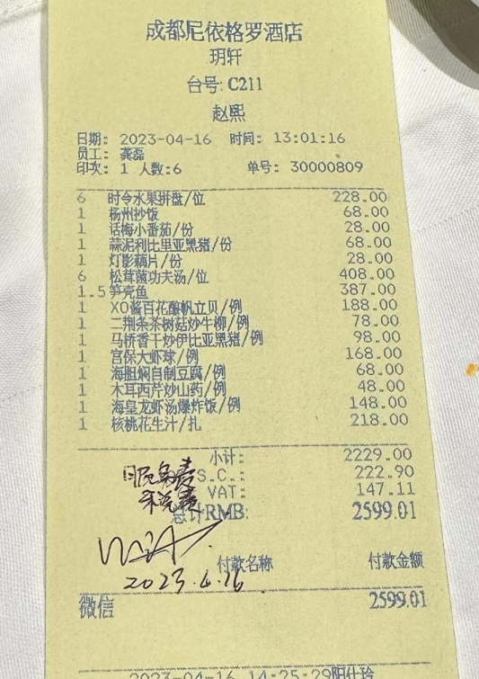 4月16日,消费质量报投诉维权中心接到消费者林先生(化名)投诉:林先生一家在位于成都市春熙路的成都尼依格罗酒店“玥轩”餐厅用餐后,发现原本只点了2229元的菜品,结账时又被莫名加收了370.01元的“服务费”和“税费”。林先生认为,餐厅收取服务费和税费的做法很不合理,于是向本报投诉。