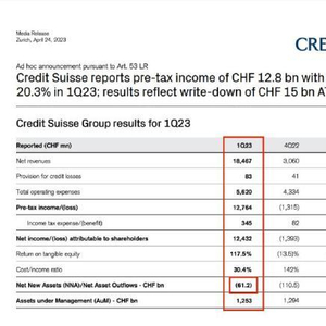财报显示,瑞信2023年首季业绩表现受到与瑞银合并计划的影响,导致存款及资产大幅流出,特别是3月下旬所有业务均录得资产净流出,令其首季资产净流出约612亿瑞郎(近690亿美元,约近5200亿元人民币)。