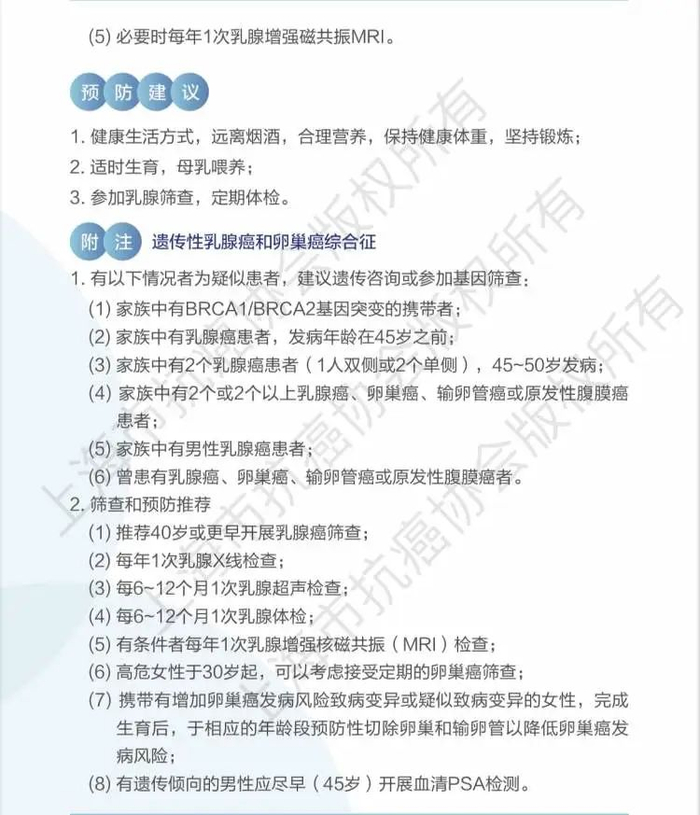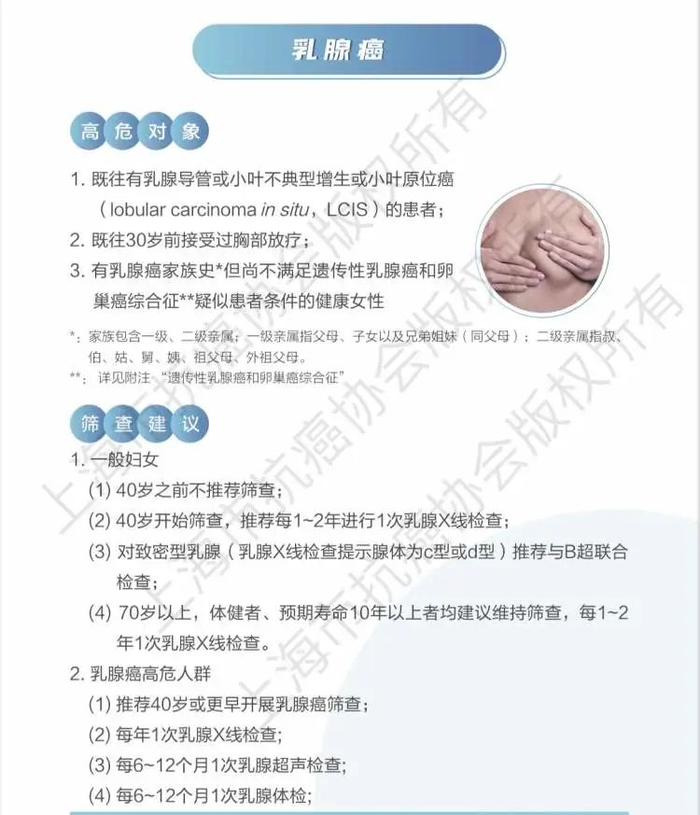 而关于乳腺癌的预防,上海市抗癌协会联合复旦大学附属肿瘤医院共同推出2023版《居民常见恶性肿瘤筛查和预防推荐》中,便有关于乳腺癌防治的详细介绍。
