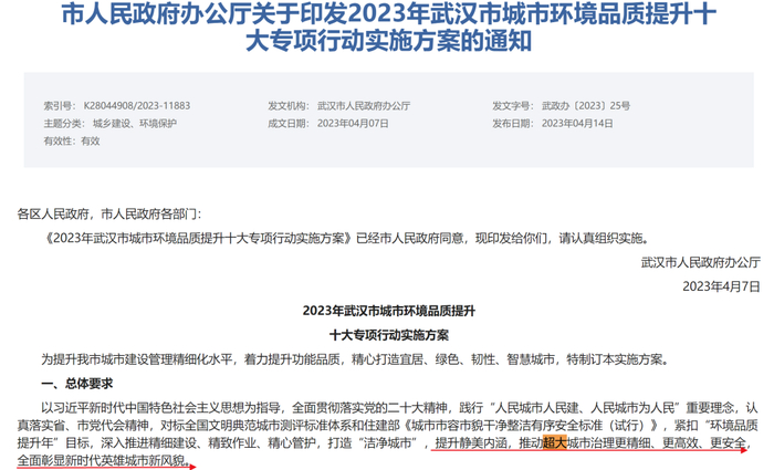 在武汉市政府最新发布的《2023年武汉市城市环境品质提升十大专项行动实施方案》中,武汉提到: