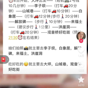 日前有网友晒出自己的攻略,号称一天之内能游8个景点,能吃上12种美食,帖子获得1.2万点赞,6500多收藏和5400多转发。