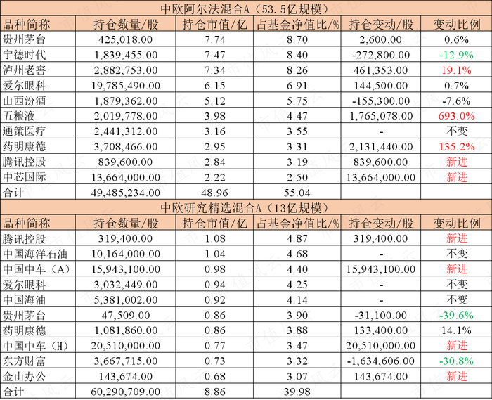另外两只基金则是砍了部分新能源个股后,进了五粮液、泸州老窖等白酒股,还大幅加仓腾讯,其中中欧研究精选混合A规模较小(13亿),直接将腾讯买到第一大仓位,此外这只基金还新进了A股和港股的中国中车。