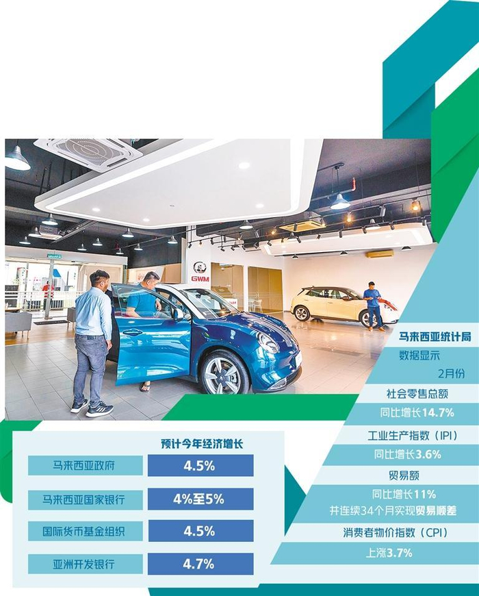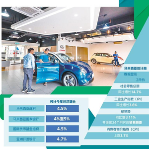 今年2月23日,马来西亚政府发布《2023年经济与财务展望报告》预计,今年国内生产总值(GDP)将实现4.5%的增长。3月27日,马来西亚国家银行在2022年年报中,继续维持之前对今年经济增长4%至5%的预测。国际货币基金组织(IMF)4月份发布的《世界经济展望》报告预计,马来西亚经济今年将增长4.5%,略高于去年10月份预估的增长4.4%。