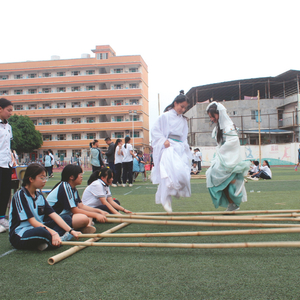 同学们穿着民族服饰欢快地跳起竹竿舞 (学校供图)