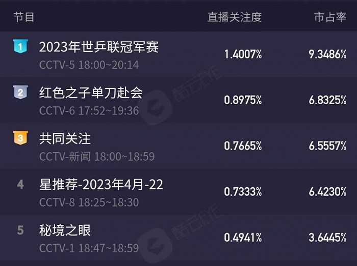 根据酷云APP的数据,4月23日晚间同时段,2023年WTT澳门冠军赛决赛转播直播关注度1.4007%,市占率为9.3486%,全平台排名第一。