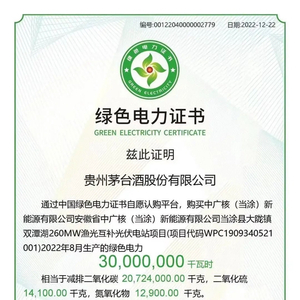 据悉,2023年,贵州茅台酒股份有限公司完成首单绿色电力市场化交易,绿电使用量将达1亿度,且实现绿色用电100%覆盖。据此核算,贵州茅台酒股份有限公司采购的绿电,将直接减少温室气体排放约9.4万吨二氧化碳当量,以平均每亩树林减排1.336吨二氧化碳折算,相当于植树7万亩。