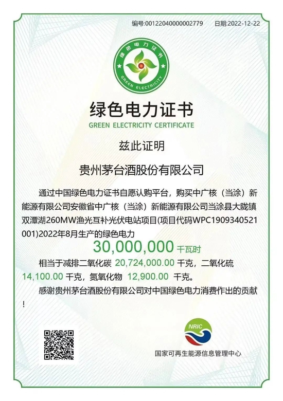 实际上,早在2022年,贵州茅台酒股份有限公司就已完成4400万度绿电采购,成功减排二氧化碳3.29万吨。2022年底,通过贵州省电力交易中心,贵州茅台酒股份有限公司作为贵州省内第一家绿电采购企业,完成了2023年至2025年的绿电采购工作。