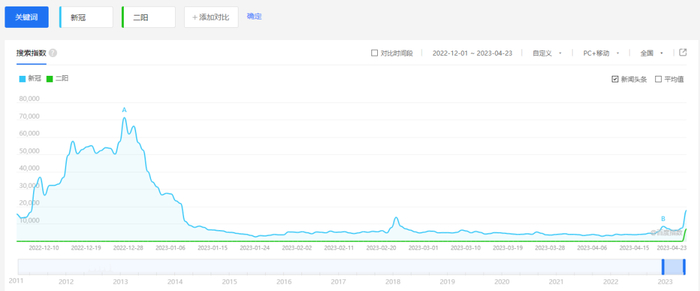 “新冠”的百度搜索指数在4月下旬有所上升,但相比2022年年底时,幅度并不大。而“二阳”的指数仅在近日略有增加。