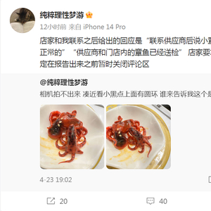 而店家的回应是“联系供应商后说小章鱼的原料是饭蛸,有斑点是正常的”“供应商和门店内的章鱼已经送检”。“店家要求我删除微博,在协商后我决定在报告出来之前暂时关闭评论区。”