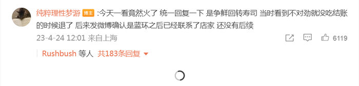 据成都商报报道,4月24日,该网友发微博称,这是一家名叫“争鲜回转寿司”的餐厅,“当时看到不对劲就没吃结账的时候退了,后来发微博确认是蓝环之后已经联系了店家”。