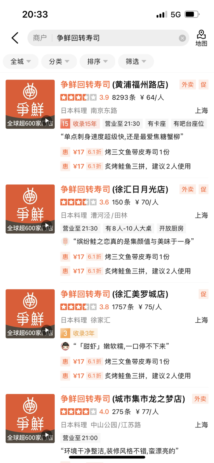 小编查询发现,“争鲜”是一家连锁的日本料理店,在上海有二十多家分店,在杭州也有两家。