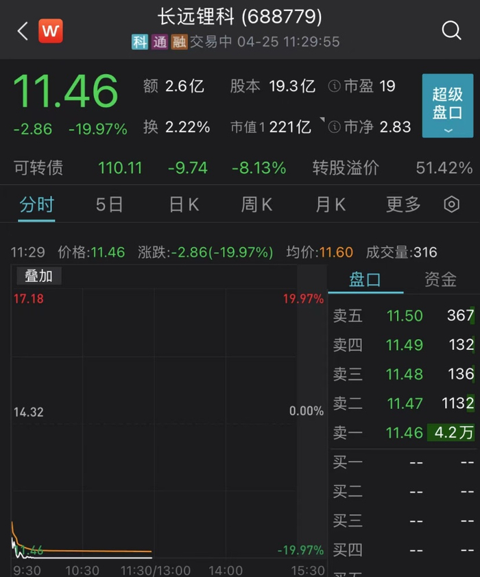 今天上午,锂电板块密集暴雷。锂电板块中,长远锂科20%跌停,公司一季度净利润92.9万元,同比下降99.69%,扣非后净亏损2114万元。