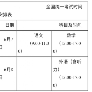 考试时间上,全国统一考试科目考试时间安排在6月7日全天和6月8日下午,其中语文考试时长为150分钟,数学、外语考试时长均为120分钟。普通高中学业水平选择性考试科目考试时间安排在6月8日上午和6月9日全天,每科考试时长均为75分钟。
