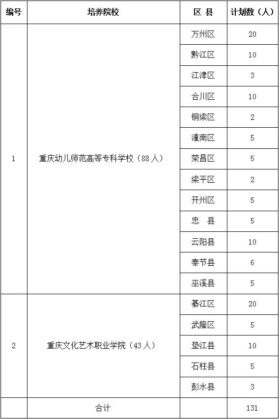 今(25)日,重庆市教委发布消息,2023年重庆市将面向全市应届初中毕业生招收学前教育公费师范生,为重庆市18个区县定向培养幼儿园教师131人,培养学制为5年,学历层次为专科。培养学校为重庆幼儿师范高等专科学校、重庆文化艺术职业学院。