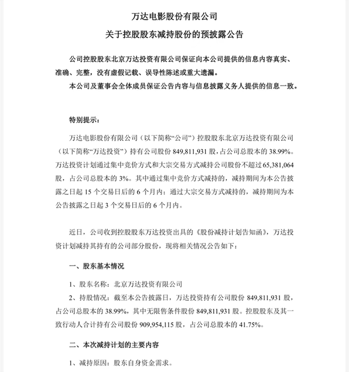 近期,万达方面开始频频减持万达电影股份。今年3月,万达电影控股股东万达投资一致行动人万达文化集团率先通过大宗交易减持2%的股份,套现约5.83亿元。