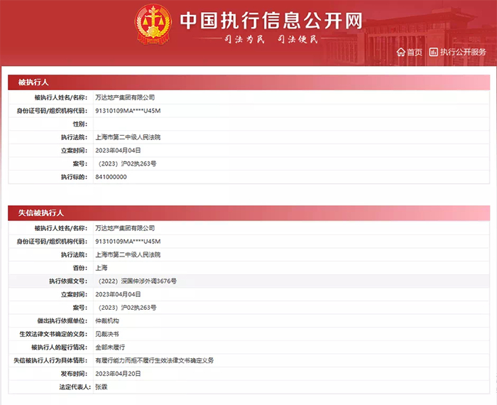中国执行信息公开网显示,4月20日,万达地产集团被上海市第二中级人民法院强制执行,涉及金额超10亿元。因未履行上述义务,公司被列为失信被执行人并被限制高消费,万达地产原法人张霖被关联限制高消费。