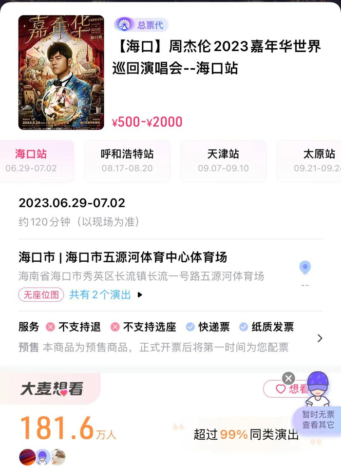 周杰伦目前官宣了海口、太原、天津等地,看看大麦网上标记“想看”的人数,181万人,怪不得每一站开票都是秒售罄。只是目前到底有没有北京场,消息迟迟未出,小伙伴们不要着急,还是等官方消息。