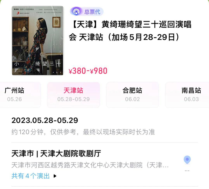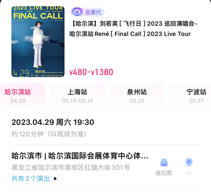 刘若英的哈尔滨站、上海站、泉州站、宁波站等多个城市也已开票。