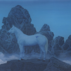 徐累的早期作品有强烈的戏剧性。帷幔、纱帐和呈45度角折叠、模仿明代版画透视规则的屏风和围墙在画面中勾勒出状似舞台的背景,人、马、蝴蝶、鹿、帽子、椅子或假山在他的画作中频繁出现,却往往难窥全貌——白衣男子用书遮住了脸,被屏风挡住上半身,或堪堪露出一只手;马从帷幔后探出头;鹿的角上挂着一顶帽子。更让人迷惑但又被深深吸引的是作品流露出的神秘和悬疑感。艺术家描绘的人物或物品都再现实合理不过,但它们被放置在一个奇异的环境中,在真实与虚假的交界处暧昧不清。徐累有时会直接在画面中明示虚假,比如将地图中的地名替换成取自地理学之外其他语境的名称。