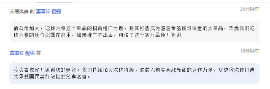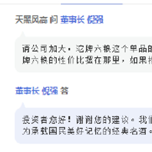 会上,有投资者向董事长倪强建议,请公司加大沱牌六粮的招商推广力度,将其打造成为超越黄盖玻汾销量的大单品,毕竟沱牌六粮的性价比摆在那里,如果推广不出去,可惜了这个实力品种!