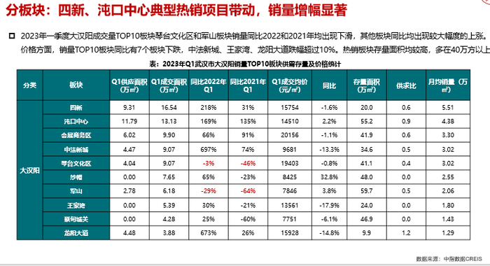 2023年一季度分版块来看,经开区的四新板块和沌口中心板块典型项目销售情况很好,整体销量涨幅显著。